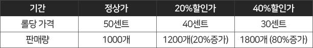 교수들이 예로 든 대표적인 사례는 가격과 판매량의 관계다. 롤당 50센트인 화장지를 할인해서 판다고 해보자. 20%인 10센트를 할인하는 경우와 40%인 20센트를 할인하는 두가지 경우다. 20%를 할인하면 판매량이 20% 늘어나고 40%를 할인하면 판매량이 80% 늘어난다. 여기서 원가, 즉 한계비용(marginal cost)은 15센트다.