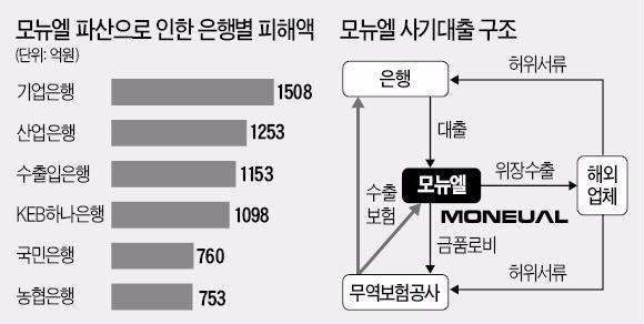 은행들은 모뉴엘이 이 같은 방법으로 연간 1조원 이상의 수출 실적을 만들었으며, 이를 바탕으로 2007년부터 총 3조원대의 대출을 일으켜 돌려막기를 하고 일부는 빼돌렸다고 보고 있다. 모뉴엘은 2014년까지 허위서류뿐만 아니라 금품로비까지 벌여 무보의 수출보증을 받은 덕분에 대출을 받았으며, 이로 인해 10여 개 은행이 피해를 봤다는 게 은행들의 판단이다.