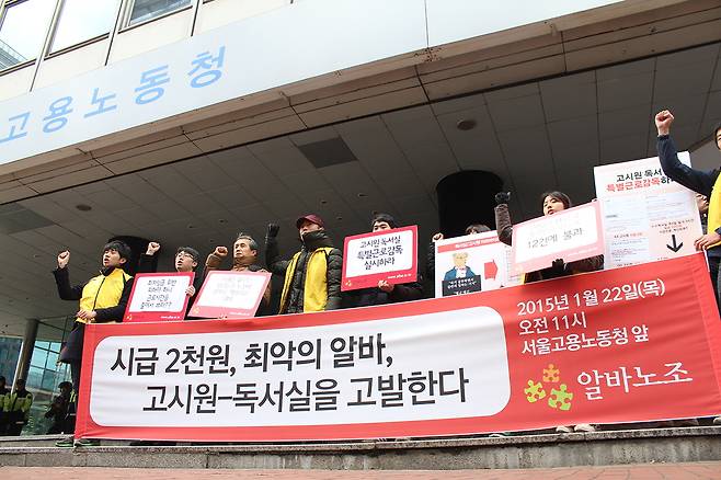 | ▲ 알바노조는 2015년 1월 22일, 서울지방고용노동청 앞에서 기자회견을 열고 총무의 열악한 노동실태를 고발했다. |