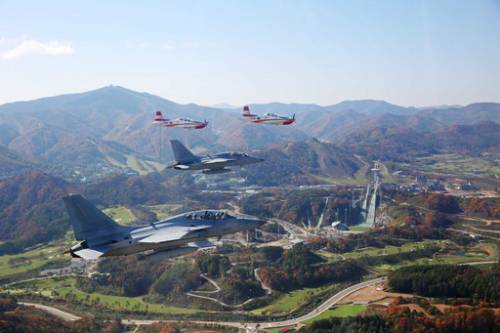 FA-50과 KT-1은 강원도 평창의 알펜시아까지 편대비행을 하며 이동했다. 2018 평창올림픽을 112일 앞뒀던 이날 올림픽의 성공적인 개최를 염원하는 의미에서 알펜시아 상공을 선회하며 항공촬영을 했다. 이후 KT-1 편대는 강원도 춘천 남이섬 쪽으로 향했다.