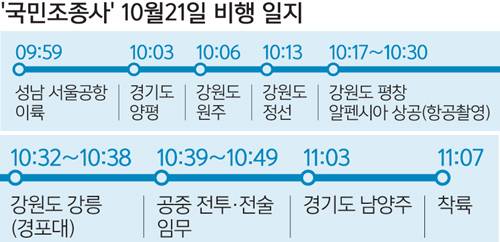 서울공항을 이륙해 강원도 평창 알펜시아와 강릉 상공을 비행하고 돌아오는 동선이었다. 기자가 탄 FA-50의 조종간을 잡은 주 대위는 “오늘 날씨가 너무 좋다. 이런 날은 손에 꼽을 정도”라며 “우리 전투기 조종사들끼리는 스스로를 ‘하늘이 받아준 사람’이라고 부르는데, 국민조종사들도 하늘이 잘 받아주는 것 같다”고 긴장을 풀어줬다.