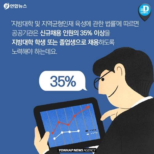 '지방대학 및 지역균형인재 육성에 관한 법률'에 따르면 공공기관은 신규채용 인원의 35% 이상을 지방대학 학생 또는 졸업생으로 채용하도록 노력해야 하는데요.