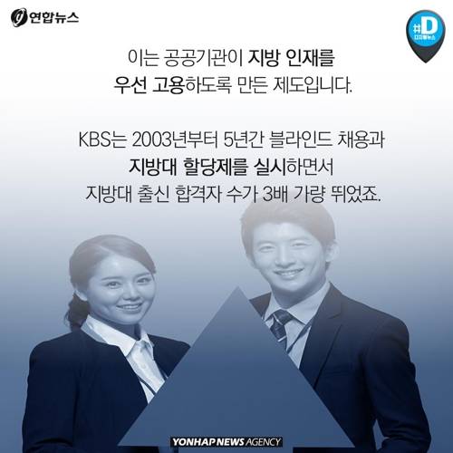 이는 공공기관이 지방 인재를 우선 고용하도록 만든 제도입니다. KBS는 2003년부터 5년간 블라인드 채용과 지방대 할당제를 실시하면서 지방대 출신 합격자 수가 3배 가량 뛰었죠.