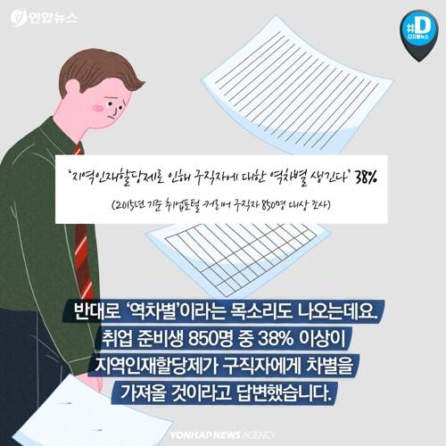 '지역인재할당제로 인해 구직자에 대한 역차별 생긴다' 38% (2015년 기준 취업포털 커리어 구직자 850명 대상 조사)