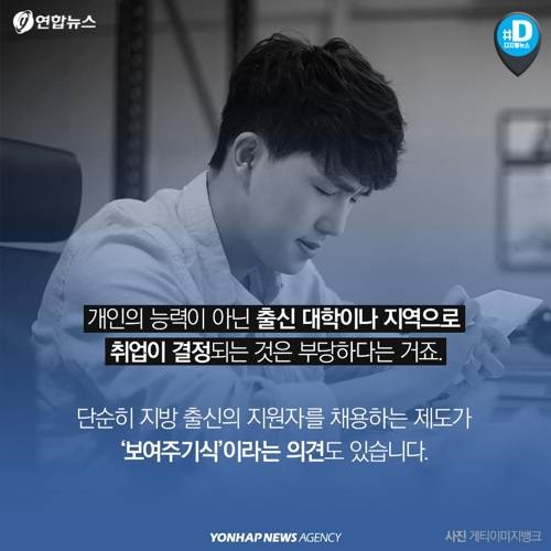 개인의 능력이 아닌 출신 대학이나 지역으로 취업이 결정되는 것은 부당하다는 거죠. 단순히 지방 출신의 지원자를 채용하는 제도가 '보여주기식'이라는 의견도 있습니다.