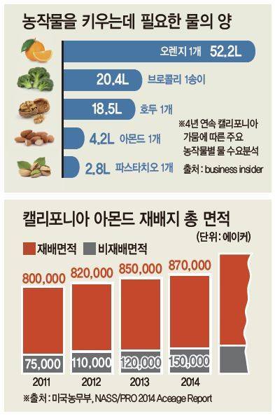 비즈니스 인사이더(Business Insider)에 따르면 아몬드 1알을 재배하는 데 필요한 물은 1.1갤런(약 4.2ℓ). 약 7000개~8000개의 아몬드를 품은 나무 한 그루의 경우 약 2만9000ℓ~3만3000ℓ의 물이 쓰인다. 미국농무부(USDA)에 따르면 캘리포니아 아몬드 농장의 총 규모는 87만 에이커(2014년기준ㆍ3520㎢)로 이를 캘리포니아 전체 아몬드 농장(1에이커당 120그루 기준)으로 확대하면 필요한 물은 무려 3조5000억ℓ에 달한다. 물 부족이 지속되면 아몬드보다 더 물이 필요한 오렌지, 호두 등 캘리포니아 주요 농산물의 재배상황은 더욱 심각해진다.