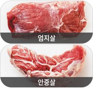 안심 : 등심보다 더 부드럽고 더 지방이 없다. 길쭉한 덩어리 2개를 합친 무게가 0.5㎏. 서양사람들이 가장 좋아하는 부위다. 장조림, 돈가스, 꼬치구이, 탕수육에 어울린다. 너무 익히면 퍽퍽하다.