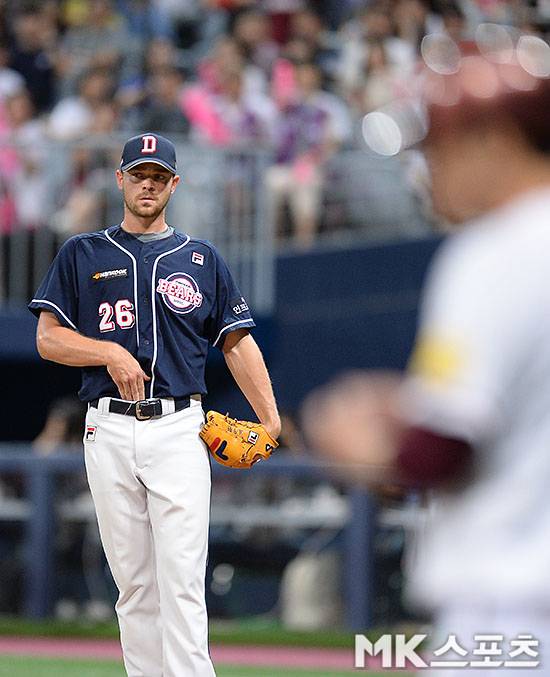 3회말 2사 만루에서 두산 선발 보우덴이 보크를 범한 후 아쉬워 하고 있다.