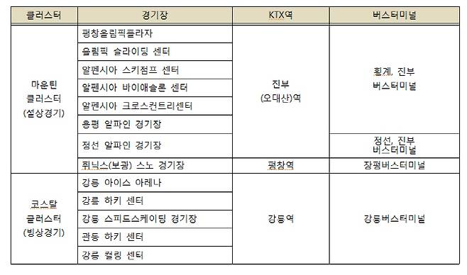 개·폐회식을 비롯해 봅슬레이 등 썰매 종목과 스키점프, 알파인스키, 크로스컨트리 스키, 바이애슬론, 스노보드 등의 경기를 즐기려면 진부(오대산)역에서 내리면 된다. 또한 프리스타일스키와 스노보드 경기는 KTX 평창역 인근에서 열린다. KTX 역에서 내려 셔틀버스를 타면 20분 이내에 경기장에 도착할 수 있다.