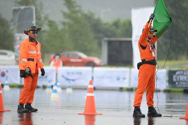 폭우가 내리다가 멈추기를 반복하는 와중에 결선 경기가 시작됐다. 오피셜과 진행요원들은 아예 우비도 벗어버린 채 비를 쫄딱 맞으며 자신의 역할에 최선을 다했다. 영어로 사회를 보며 대회 진행을 깔끔하게 이끈 ‘미녀레이서’ 박보람도 흐트러짐 없는 밝은 표정으로 중심을 잡았다.