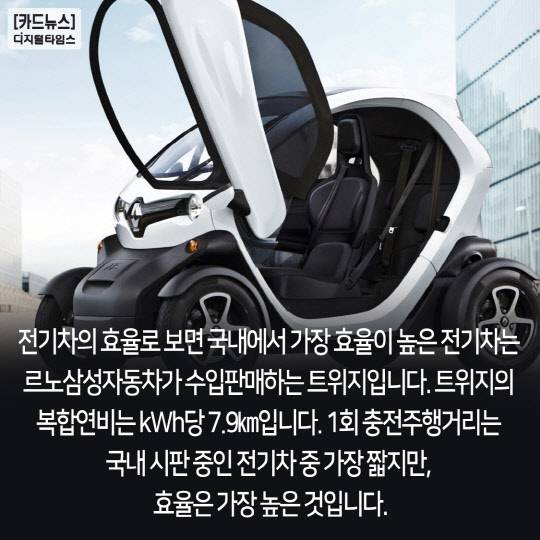 전기차의 효율로 보면 국내에서 가장 효율이 높은 전기차는 르노삼성자동차가 수입판매하는 트위지입니다.