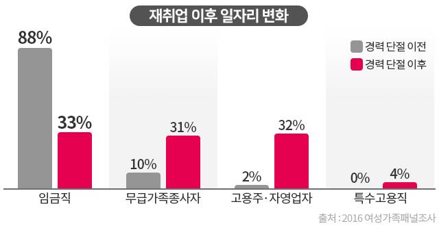 경력 단절 이후 재취업을 한 여성들은 어떤 지위를 갖게 될까. 2016년 여성가족부의 여성 가족 패널조사에 따르면, 경력 단절 이전에는 88%에 달하던 임금직 비율이 경력 단절 이후 재취업 시에는 33%로 급감한다. 이전의 업무와는 다른 일을 하게 될 가능성이 높다는 얘기다.
