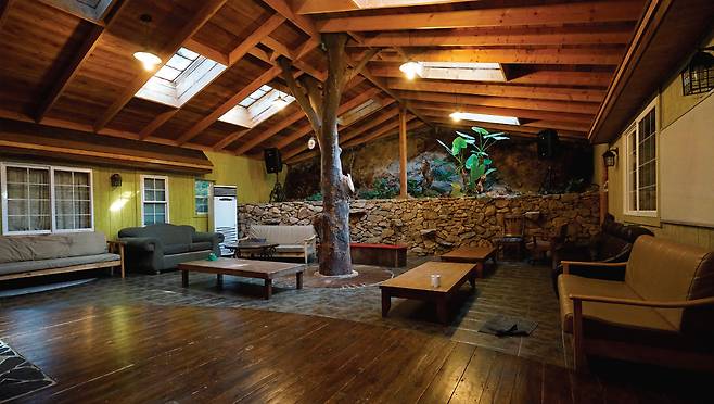 사무실 뒤쪽으로는 두 채의 펜션이 마주 보고 있다. 들어선 공간은 굉장히 넓었다. 20명 정도가 이용할 수 있는 펜션이었다.구경하는 데만도 시간이 꽤 걸렸다. 각각의 방은 모두 복층의 구조로 되어 있고, 복층의 모양새는 다락방과 닮아 있다. 거실을 가운데 두고 벽 쪽으로 방이 있기 때문에 단체 모임 시에도 좋을 듯하다. 항상 밤새 노는 사람들과 일찍 자는 사람들이 있으니 서로를 방해하지 않을 수 있다.