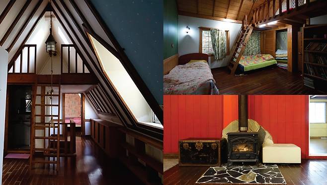 입구에서 오른쪽은 주방,왼쪽은 거실인데 정중앙에 커다란 나무가 집을 받치듯 떡하니 버티고 있다.한동안 넋을 잃고 실내 풍경을 바라보았다.높은 천장과 천창,창 위에 떨어진 나뭇잎에 쏟아지는 햇살.그것 하나 만으로도 충분히 아름다웠고 따끈따끈했다.나무를 중심으로 의자가 널찍하게 놓여있고,붉은 벽을 배경으로 놓인 오래된 궤짝과 난로는 동화책 속에서 방금 꺼내 놓은 듯한 모습이다.