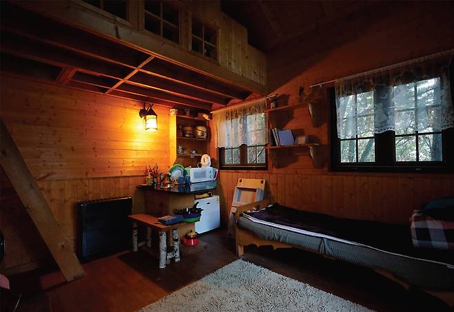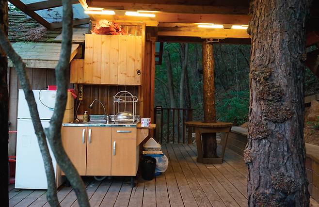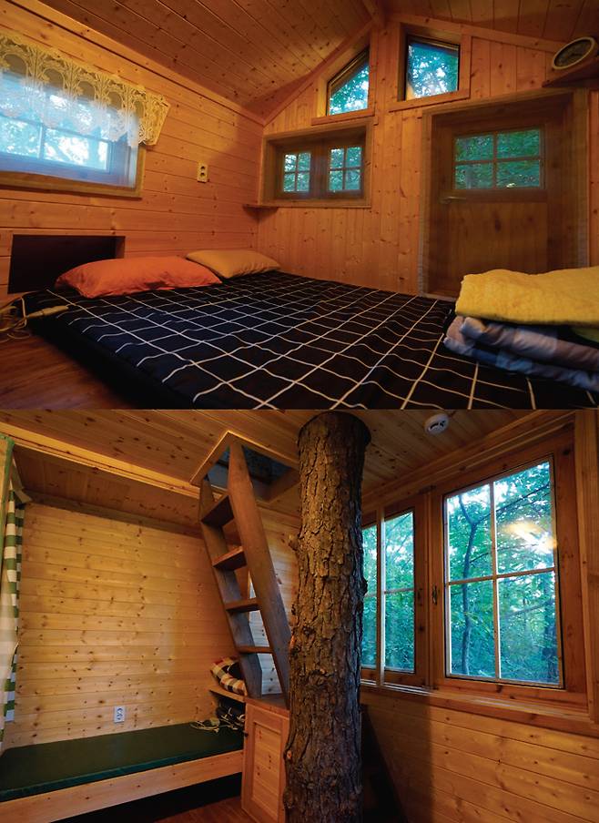 톰의 통나무집은1, 2층으로 되어 있어 두가구가 가거나 아이들과 따로 지내거나 하면 될 듯하다. 독립적인 공간이니 아이들이 더 좋아할지도 모른다. 이곳 역시 내부에는 나무가 통나무집을 관통하고 있다. 나무를 그대로 살려 지은 집이라 그런지 더욱 운치 있다. 외부에는 넓은 테라스가 있어 그곳에서 식사를 만들어 먹거나 차를 마시면 된다. 전기도 마련되어 있고, 모기향도 넉넉하다.