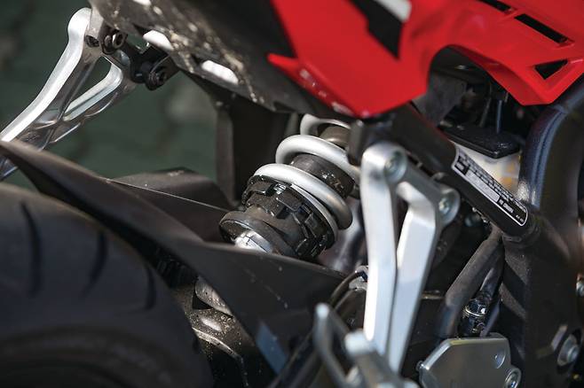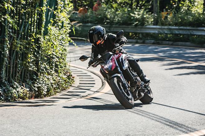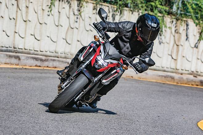 기어 시프트는 가볍지만 절도 있게 동작하여 톡톡 기어를 바꿔주며 rpm을 라이더의 의도대로 가져갈 수 있다. 스로틀을 공격적으로 열면 rpm 게이지가 재빠르게 치솟아 오르며 단숨에 8000rpm을 넘어 1만 rpm 이상까지 돌며 남은 포텐셜을 뽑아낸다. 저속과 고속에서 바이크의 인상이 달라지는 점이 매력적이다. 미들급 클래스에서 기대할 수 있는 충분한 피드백이다. 달리는 재미는 와인딩에서도 유효하다. 자연스러운 포지션과 차체 하단으로 집중된 무게 밸런스 덕분에 움직임이 예측을 넘어서지 않고 라이더가 의도한 대로 반응한다. 기본기가 탄탄해 바이크를 믿고 더욱 날카롭고 공격적인 주행을 하게 되는 것은 반가운 부작용이랄까.