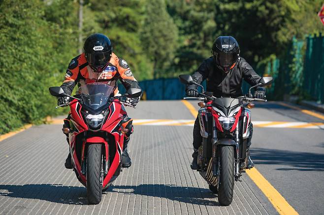 두 모델은 엔진과 섀시 등 거의 모든 부품을 공유하는 형제 모델이다. 프런트 페어링 유무와 핸들 바 높이 정도가 차이라면 차이인데 이 차이만으로도 성격은 꽤나 다르다. 라이딩의 재미는 확실히 네이키드인 CB 쪽이 좋다. CB는 국내 시장에는 한동안 맥이 끊어졌다 새롭게 추가된 선택지인 만큼 좀 더 신선한 느낌이 있다. 무게도 가볍고 가격이 100만 원이나 저렴하다는 것도 CB의 장점이다. 시내 주행에서 충분한 출력과 다루기 쉬운 특성으로 데일리 바이크로 좋다. 반면 CBR 쪽은 좀 더 진지한 달리기에 어울린다. 비록 날카롭게 날을 세운 슈퍼바이크는 아니지만 달리는 감각은 충분하다. 그러고 보면 CB에 비해서 시내 주행이 딱히 불편한 수준도 아닌 데다가 방풍성을 높여주는 페어링은 장거리에서는 큰 이득이다. 또 제법 무게가 나가는 헤드라이트와 계기반이 프런트 포크가 아닌 프레임에 마운트 되기 때문에 핸들링도 가벼운 장점이 있다. 그래서 CBR 쪽이 활동 영역이 좀 더 넓은 올라운드 플레이어 느낌이다. 주말에는 장거리 투어도 다니고 와인딩 로드를 즐기는 편이라면 CBR을 추천하고 싶다.