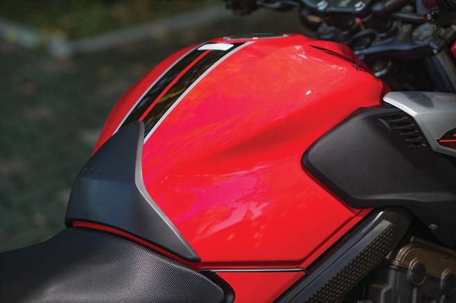 날카로운 프런트 마스크가 눈에 띈다. LED 헤드램프는 CBR650F와 같은 것이지만 분위기가 사뭇 다르다. 입체적이면서도 각진 헤드라이트 커버가 헤드램프 주변으로 밀집되어 맹수의 얼굴을 보는 듯 작고 날렵하다. 그 뒤로 슬쩍 부풀린 슈라우드가 프런트의 볼륨감을 잘 잡아줘 다소 심심한 연료탱크 디자인에 포인트가 된다.
