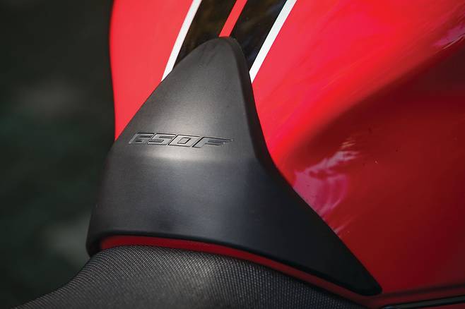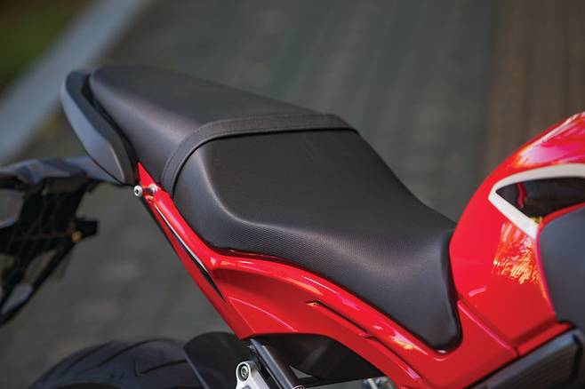 시트는 적당히 편안하다. 동승자 일체형 시트는 완만한 굴곡과 폭신한 쿠션을 느낄 수 있다. 반면 디자인 자체는 조금 심심한 편. 시트고는 810mm로 동일 클래스 모델 대비 무난한 수치다. 풋 페그의 위치는 전형적인 미드 컨트롤로 라이딩 포지션을 취했을 때 자연스럽고 풋 레버를 동작할 때에도 편했다.