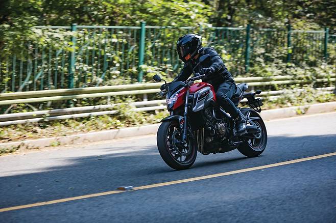 기어 시프트는 가볍지만 절도 있게 동작하여 톡톡 기어를 바꿔주며 rpm을 라이더의 의도대로 가져갈 수 있다. 스로틀을 공격적으로 열면 rpm 게이지가 재빠르게 치솟아 오르며 단숨에 8000rpm을 넘어 1만 rpm 이상까지 돌며 남은 포텐셜을 뽑아낸다. 저속과 고속에서 바이크의 인상이 달라지는 점이 매력적이다. 미들급 클래스에서 기대할 수 있는 충분한 피드백이다. 달리는 재미는 와인딩에서도 유효하다. 자연스러운 포지션과 차체 하단으로 집중된 무게 밸런스 덕분에 움직임이 예측을 넘어서지 않고 라이더가 의도한 대로 반응한다. 기본기가 탄탄해 바이크를 믿고 더욱 날카롭고 공격적인 주행을 하게 되는 것은 반가운 부작용이랄까.