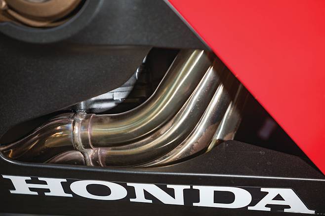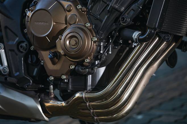 엔진은 섀시와 밀착되어 시각적으로 느껴지는 부피감은 콤팩트한 편이다. 4기통 엔진의 존재감과 각 실린더에서 빠져나온 네가닥의 매니폴드 라인은 기계적인 아름다움을 극대화한다. 물결 모양의 굴곡을 연출한 매니폴드는 마치 금관악기 같아 보여 배기음에 대한 기대감이 생기게 한다. 엔진 실린더 커버와 클러치 커버에 골드 컬러를 채용한 점은 마음에 든다. 큼직한 엔진의 크기를 시각적으로 분산시키면서도, 바이크를 한 단계 위급으로 보이게 할 만큼 고급스럽다.