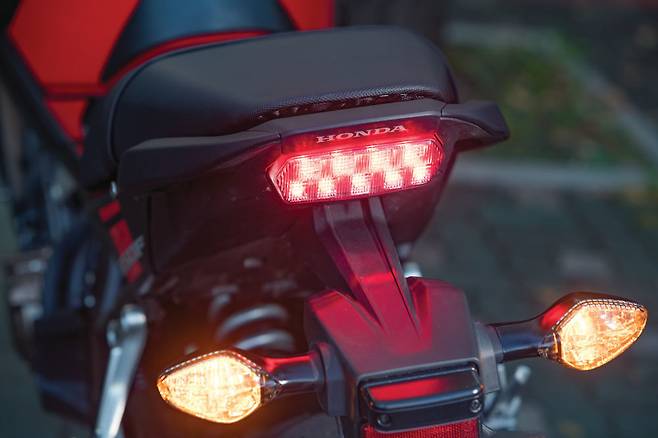 언더슬렁 머플러를 적용해 리어 타이어와 리어 엔드 사이의 공간에 개방감을 주었다. 날렵하게 디자인된 Y자 스포크 휠이 적용된 전후 17인치 휠을 적용하고 휠림에 스티커를 붙인 것도 스포티한 인상을 강조한다. LED 테일라이트와 턴 시그널 램프, 풋 페그 등 다수의 파츠가 기존 혼다 모델에서 봤던 것들로 공유 파츠를 통한 원가절감을 노렸다. 그럼에도 차체 디자인을 흐트러뜨리거나 어느 한 곳이 도드라지는 것 없이 잘 어울리는 점은 마음에 든다.