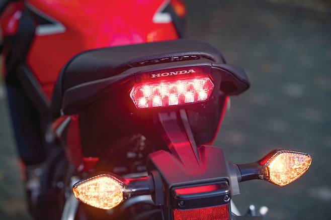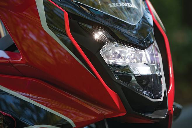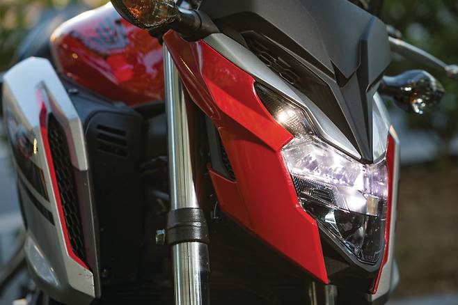 날카로운 프런트 마스크가 눈에 띈다. LED 헤드램프는 CBR650F와 같은 것이지만 분위기가 사뭇 다르다. 입체적이면서도 각진 헤드라이트 커버가 헤드램프 주변으로 밀집되어 맹수의 얼굴을 보는 듯 작고 날렵하다. 그 뒤로 슬쩍 부풀린 슈라우드가 프런트의 볼륨감을 잘 잡아줘 다소 심심한 연료탱크 디자인에 포인트가 된다.