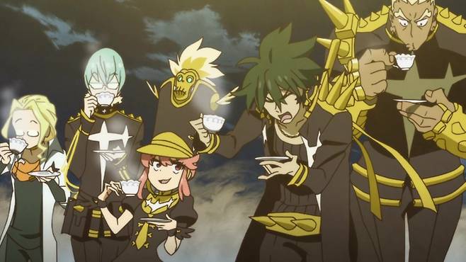 | ▲ 애니메이션 <킬라킬>의 한 장면. 왼쪽부터 재봉부 '이오이 시로', 정보부 '이누무타 호카', 문화부 '자쿠즈레 노논', 운동부 '사나게야마 우즈', 선도부 '가마고리 이라'. 간부는 네 명이지만, 재봉부는 극교복을 만드는 부서라 그에 준하는 대우를 받는다. |
