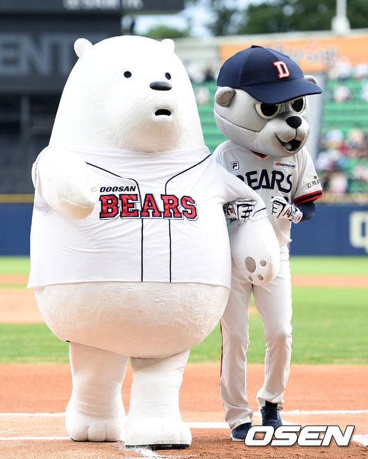 경기에 앞서 두산 마스코트가 시구를 하고 경기장을 나가고 있다. /sunday@osen.co.kr