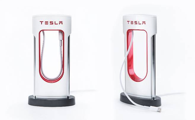 실제 슈퍼차저에 사용된 3D CAD 데이터를 가지고 그대로 축소 제작한 제품으로 굴곡이나 표면처리까지 실제 전기차용과 비슷하다. 케이블을 보관하는 방식까지 실제와 똑닮은 모습.