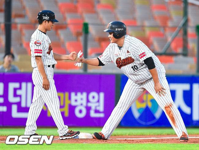 [OSEN=부산,박준형 기자] 9일 오후 부산 사직구장에서 열린 2017 타이어뱅크 KBO리그 롯데 자이언츠와 kt 위즈의 경기, 1회말 1사 롯데 강민호 타석때 2루 주자 이대호가 도루 성공한뒤 3루 코치와 하이파이브를 하고 있다. / soul1014@osen.co.kr