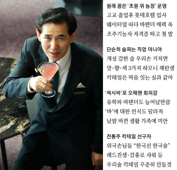 ▷지금은 없지만 바텐더라는 직업 자체가 오해를 사던 시절엔 회의감이 컸다. 초창기 우리나라 바 문화가 상당히 왜곡돼 있던 시절이다. IMF 사태를 전후로 '섹시바' '토크바' 같은 유흥업소 바가 난립했을 때가 있다. 얼마나 좋은 술을 내느냐가 중요한 게 아니라 그저 여성이 술을 따라주고 옆에 앉아 있으면 되는 식이었다. 진심으로 술에 대해 고민하는 바, 손님과 교감하려는 바는 발길이 끊겼버렸다. 그러다 일부 잘못된 바들의 행태가 전체의 것인 양 비난을 받을 때는 '내가 이 일을 왜 하고 있나' 하는 허탈감이 컸다. 다행히 이제는 그런 바가 거의 사라졌다. 사람들이 눈을 뜬 것이다. 요즘 싱글몰트 위스키 바가 확 늘어나고 있는 건 아시나? 이제 술 자체를 주제로도 대화할 수 있는 시대가 열리고 있다. '문화가 있는 바'의 시대 말이다. 조주사 자격증을 가진 사람만 4만7000명이다. 훌륭한 후배 바텐더들도 정말 멋있게 즐길 수 있는 바를 만들어가고 있다. 외국의 바텐더들도 한국을 찾고, 유학파 바텐더도 늘어났고. 바텐더들이 조금만 더 노력하면 우리나라에서도 바 문화가 확고하게 정착할 수 있을 것이다.