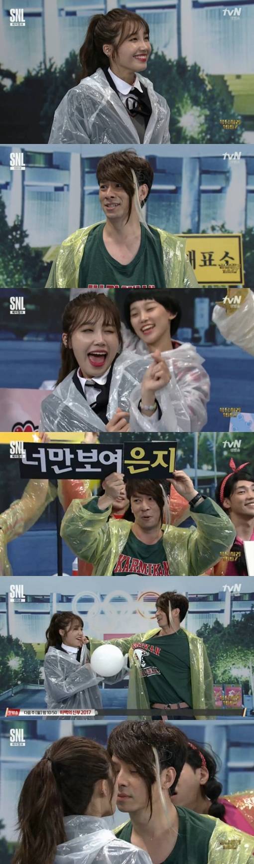 코너 스토리상 사랑에 빠진 정은지와 정상훈은 서로의 얼굴에 우유와 아이스크림을 묻히며 끝까지 폭소를 유발했다. 두 사람은 'SNL9' 마지막 코너인 '위켄드 업데이트'에서 함께 노래로 풍자도 하며 범상치 않은 코믹 케미를 발산했다.(사진=tvN 'SNL코리아 시즌9' 캡처)