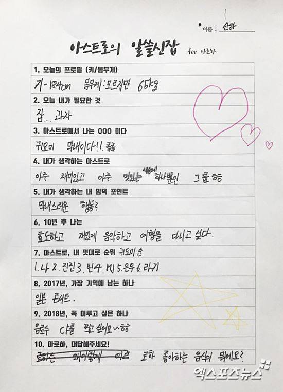 각자 원하는 싸인펜을 골라쥐고 질문지를 쓰면서, MJ는 보라색을 골랐습니다. 아로하를 생각하기 때문이라네요. 센스있는 MJ의 말에 아스트로 멤버들 모두 별생각없이 집었던 싸인펜 컬러에 황급히 의미를 부여해야 했습니다.