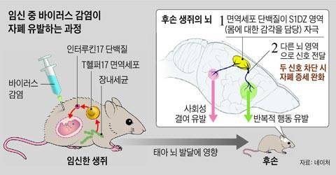 연구진은 또 바이러스 감염이 뇌에 미치는 영향도 구체적으로 밝혀냈다. 면역세포는 뇌에서 몸에 대한 감각을 담당하는 영역을 공략했다. 이곳에서 나오는 신호를 차단하자 생쥐의 자폐 행동이 크게 줄었다는 것이다.