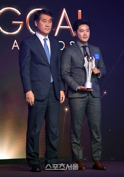 이승우의 형 이승준(오른쪽)이 9일 서울 서초구 반포동 세빛섬에서 진행된 2017 대한축구협회 시상식에서 베스트골 대리 수상을 한 뒤 조병득 부회장과 함께 기념촬영을 하고 있다.
