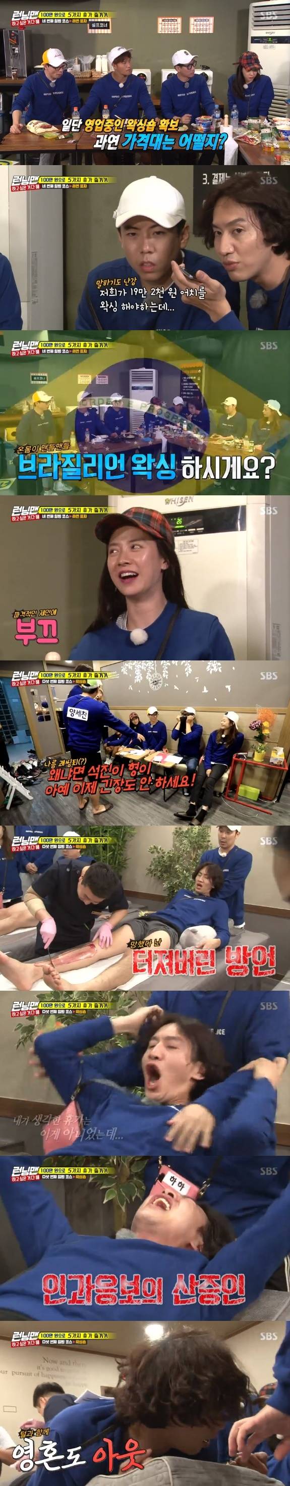 라면 뷔페에서 거하게 저녁을 해결한 '런닝맨' 멤버들은 마지막 미션인 왁싱을 받기 위해 왁싱샵으로 향했다.