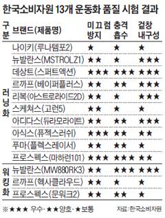한국소비자원은 10개 브랜드 운동화 13종(러닝화 10종·워킹화 3종)의 미끄럼 방지, 충격 흡수, 내구성 등 품질을 비교 시험했다고 16일 밝혔다. 브랜드별로 가장 저렴한 제품을 골랐고, 시험 항목별로 우수, 양호, 보통 순으로 세 가지로 등급을 나눴다.