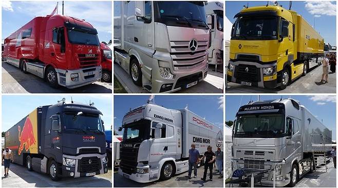 각 팀의 캠프 뒷켠에는 그들이 타고 온 대형 트럭들이 세워져 있었다. 행사 중 혹시 모를 사고나 타이어 소모에 대비해 여분의 부품과 관리 장비들을 한가득 싣고 온 트럭들이다. 그런데 문득 궁금증이 생겼다. 이들은 과연 어떤 회사의 트럭을 타고 다닐까? 6개 레이스 팀의 트럭들을 몰래(?) 훔쳐봤다.