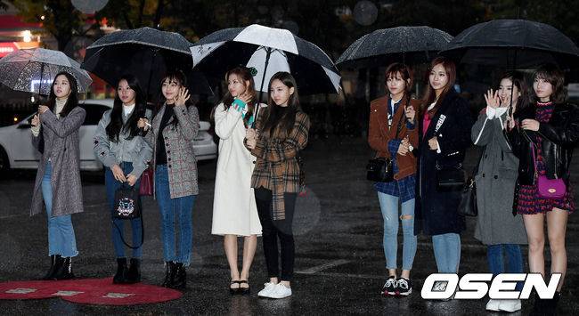 빨간 우산 파란 우산 찢어진 우산은 아니군요.. 요즘은 편의점 우산 골프장 우산 그리고 자동 우산입니다. 정상의 걸그룹 트와이스의 가을 비 우산 속 '뮤뱅 출근길'이었습니다. /osenstat@osen.co.kr