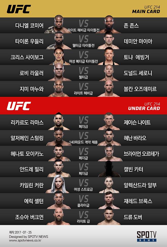UFC 214 언더 카드 경기는 오는 30일 일요일 아침 7시 30분 SPOTV ON과 SPOTV에서 생중계된다. 메인 카드는 오전 11시부터 SPOTV ON에서 독점 생중계된다.