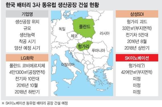 정부관계자는 "SK이노베이션이 헝가리 코마롬지역 산업단지에 유럽 전기차 배터리공장을 건설하는 방안을 추진 중인 것으로 알고 있다"며 "이미 현지 지방정부로부터 환경영향평가 등 행정절차 승인을 얻은 상태"라고 전했다.