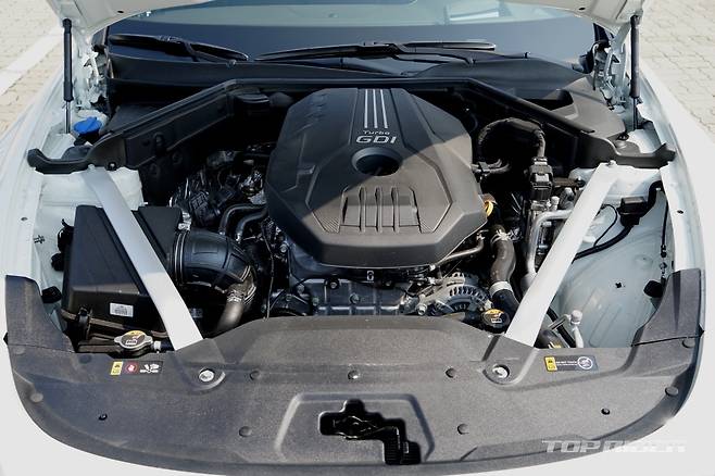 스팅어 2.0 터보에는 2.0 T-GDI 터보엔진이 적용돼 6200rpm에서 최고출력 255마력, 1400-4000rpm에서 최대토크 36.0kgm를 발휘하며, 8단 자동변속기와 조합된다. 19인치 휠 2WD 기준 공차중량은 1670kg, 복합연비는 10.1km/ℓ(도심 9.1, 고속 11.8)다.
