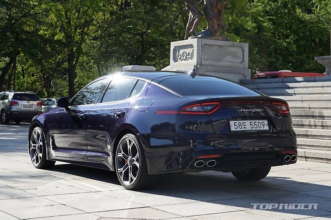 스팅어의 전면에는 디자인을 위한 디테일이 지나치게 많다. 보닛의 에어벤트 장식이나 독특한 헤드램프, 강조된 에어벤트는 모두 차량 전면에 몰려있다. 하지만 스팅어 디자인의 백미는 프로포션이다. 후륜구동 특유의 길고 늘씬한 차체가 아름답다.