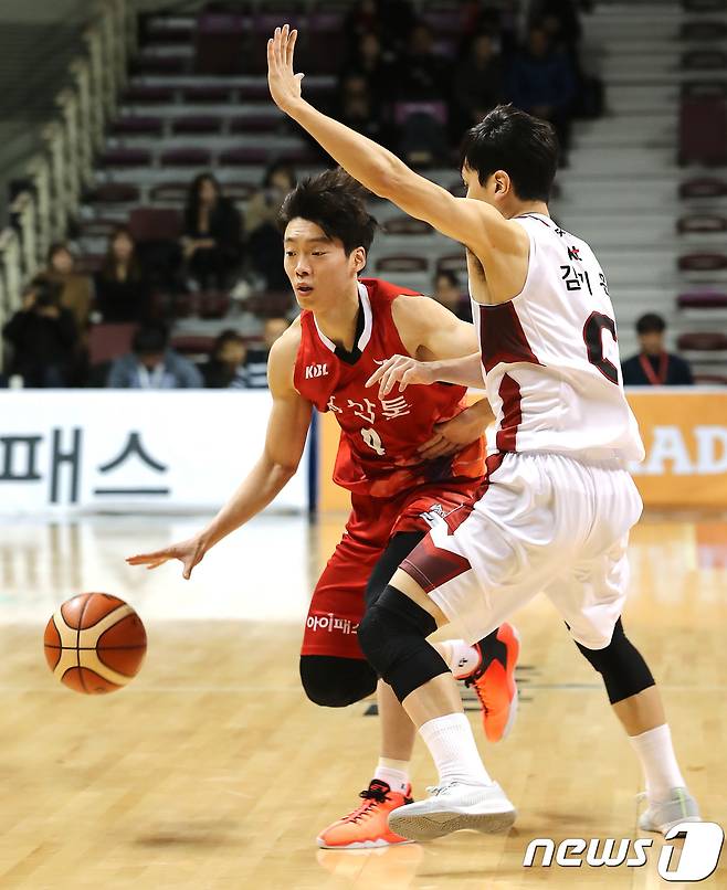 (안양=뉴스1) 오장환 기자 = 30일 오후 경기도 안양시 안양실내체육관에서 열린 '2017-2018 정관장 프로농구' 안양 KGC 인삼공사와 부산 KT 소닉붐의 경기에서 안양 KGC 이재도가 돌파를 하고 있다. 2017.11.30/뉴스1