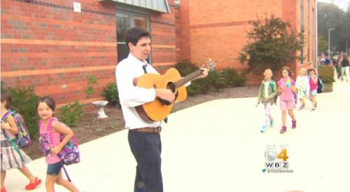 등굣길 아이들을 위해 매일 기타를 퉁기며 노래하는 미국의 한 초등학교 교사 사연이 감동을 주고 있다.