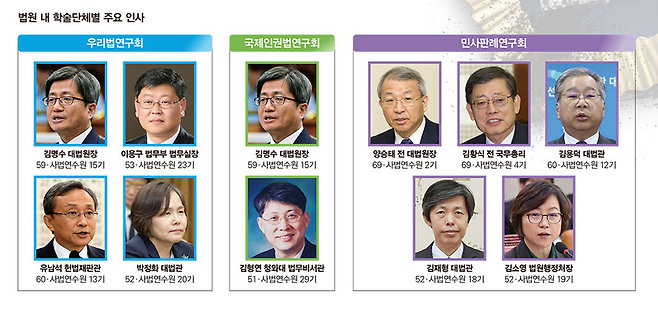 과거 보수정권에서도 비슷한 일이 있었다. 이명박-박근혜 정부 때 주요 요직을 민사판례연구회 소속 인사들이 차지했다. 양창수 전 대법관도 임용 당시 민사판례연구회 회장이었고, 민사판례연구회 소속 양승태 전 대법원장, 김황식 전 대법관·국무총리, 김용덕 대법관 등도 이명박-박근혜 정부 시절 승승장구했다. 법원 내 인사권을 쥐고 있는 대법원 법원행정처 요직에도 이민걸 전 기획조정실장, 홍승면 전 사법지원실장 등 민사판례연구회 출신들이 다수 포진해 있었다.