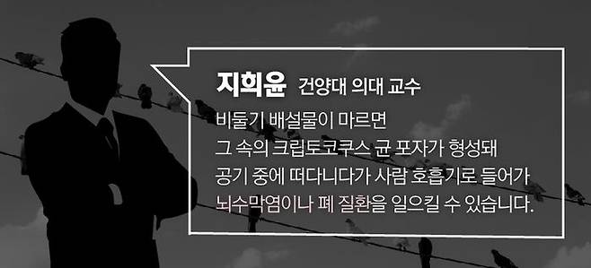 다만, 전문가들은 "크립토코쿠스가 건강한 일반인에게 문제 될 가능성은 크지 않지만, 질환을 앓고 있어 면역력이 떨어진 경우 감염 가능성이 커지기 때문에 주의해야 한다"고 말합니다. 일각에서는 비둘기의 깃털이 아토피성 피부염을 일으키는 원인이라는 지적도 있습니다.