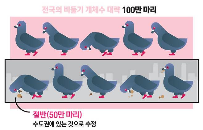 집비둘기가 유해동물로 지정됐지만 관리는 허술한 실정입니다. 개체 수가 정확히 파악되지 않은 가운데 대한조류협회 등은 현재 전국의 비둘기 개체 수를 대략 100만 마리로 추정하고 있습니다. 이 중 절반인 50만 마리는 수도권에 있는 것으로 추정됩니다. 다른 조류와 비교해 많은 수치는 아니지만, 문제는 비둘기들이 자연이 아닌 사람들이 거주하는 지역이나 도심에 집중돼 있다는 겁니다.