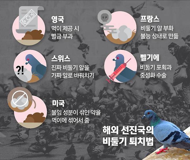 오래된 건물이 많은 유럽 등지에서는 이런 피해를 줄이기 위해 비둘기와의 전쟁을 선포하기도 했습니다. 영국은 비둘기에게 먹이 제공 시 50파운드(7만 2천 원)를 부과하고 먹이를 제공한 노점상은 영업 정지 처분을 받습니다. 프랑스는 공원에 비둘기집을 설치해 알을 낳게 한 뒤, 집을 흔들어 알을 부화 불능 상태로 만드는 방법을 쓰기도 합니다. 우리나라의 경우 비둘기를 어떻게 관리할지 제대로 논의조차 안됐다고 볼 수 있습니다.
